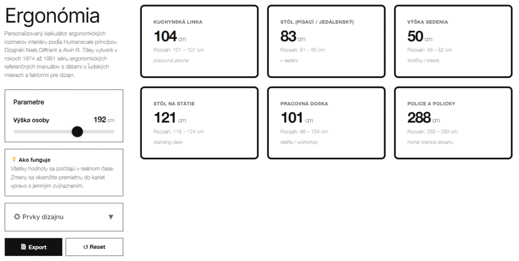 Práve preto má zmysel pracovať s nástrojmi, ktoré dokážu tento rozdiel odhaliť ešte pred realizáciou. Personalizovaný ergonomický kalkulátor (nájdete tu) založený na princípoch Humanscale a dátach Diffrienta a Tilleyho umožňuje prepočítať návrh na konkrétne telo a okamžite vidieť, ako sa mení pri rôznych parametroch. Jeho najväčšou hodnotou nie je len presnosť, ale schopnosť konfrontovať návrh s realitou. Ukazuje, že ergonómia nie je otázkou názoru ani estetického rozhodnutia, ale merateľnej fyzickej skutočnosti.