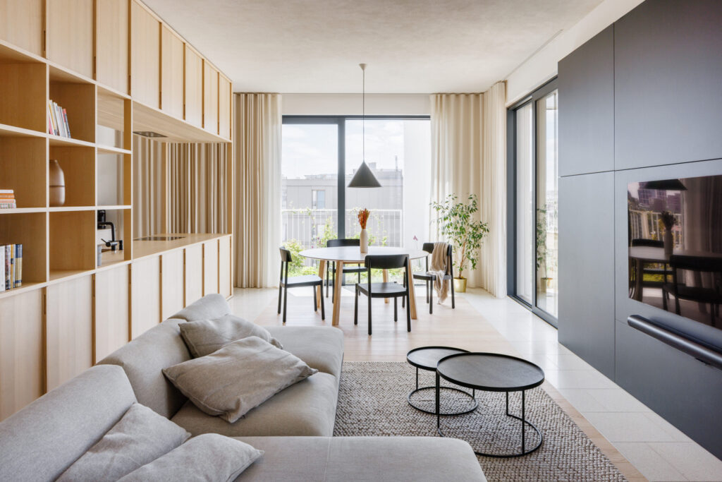 Dominujú mu prírodné materiály, jaseňové drevo, liaty terazzo povrch a jemne sivé omietky, ktoré spolu vytvárajú teplý a nadčasový interiér. Najväčšou devízou je strešná záhrada, kde sa spája wellness zóna s detským kútikom a kuchyňou pod holým nebom.